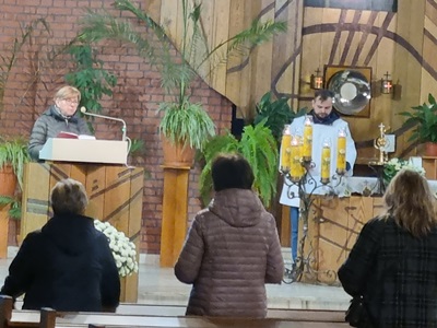 W każdy ostatni poniedziałek miesiąca o godzinie 18.00 na mszy parafialnej Wspólnota Ewangelizacyjna WODA ŻYWA zajmuje się oprawą Eucharystii. W dniu 31 października 2022 celebransem mszy świętej był ks. Piotr Orliński - opiekun kościelny Wspólnoty. Oprawą muzyczną zajął się zespół muzyczny WODA ŻYWA, a czytania, śpiew psalmu, dary przejęli członkowie Wspólnoty. Na zdjęciu Jadzia Darmozych przy czytaniu modlitwy wiernych.